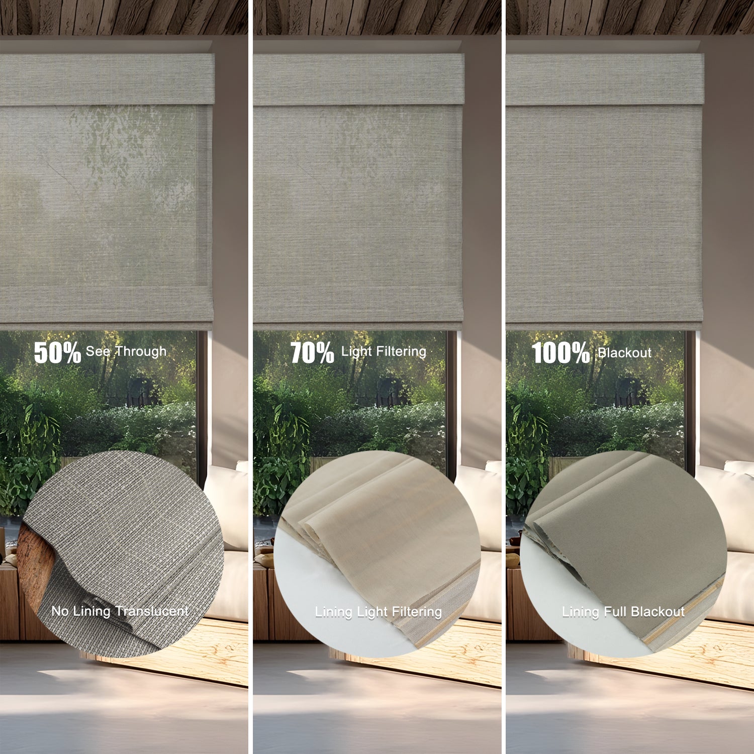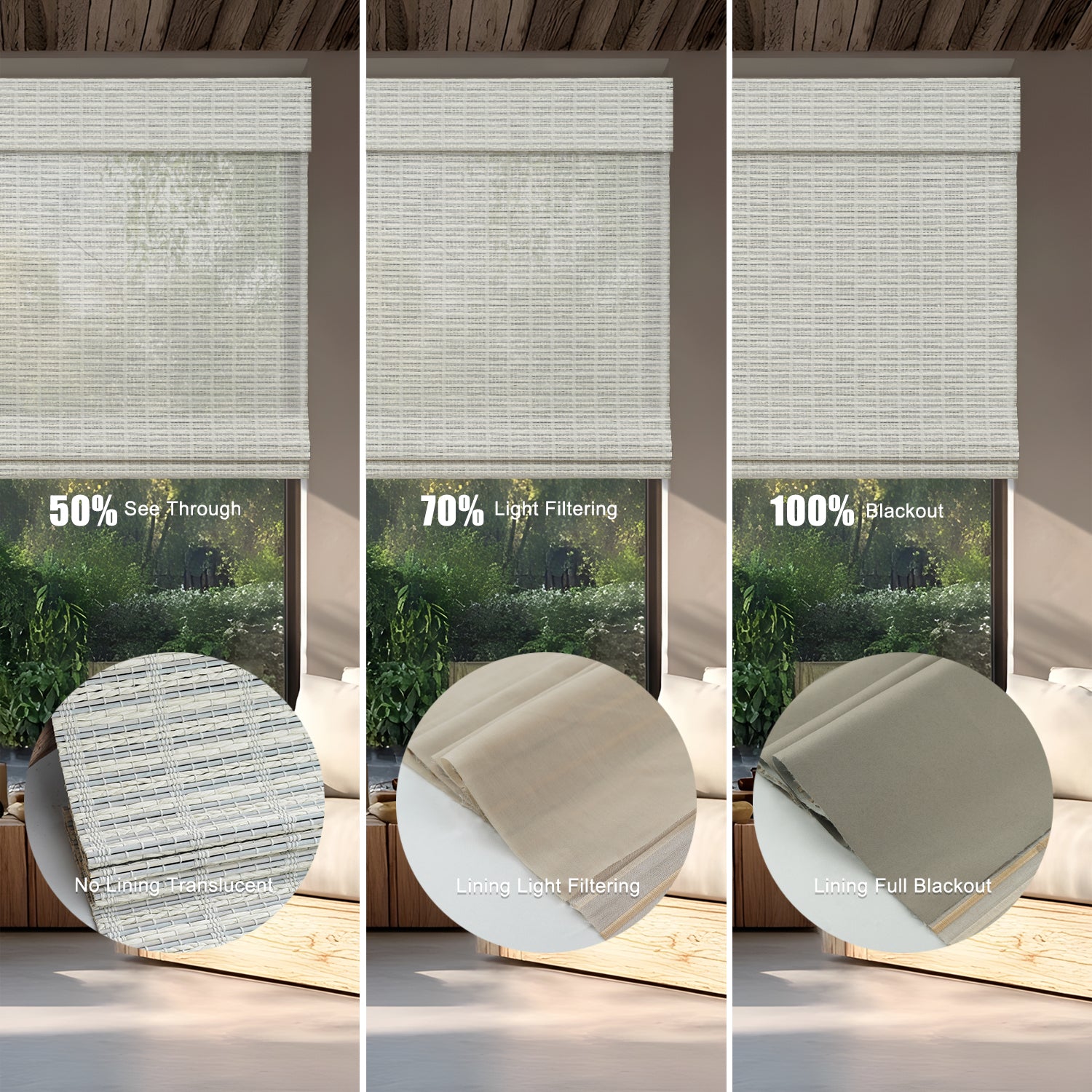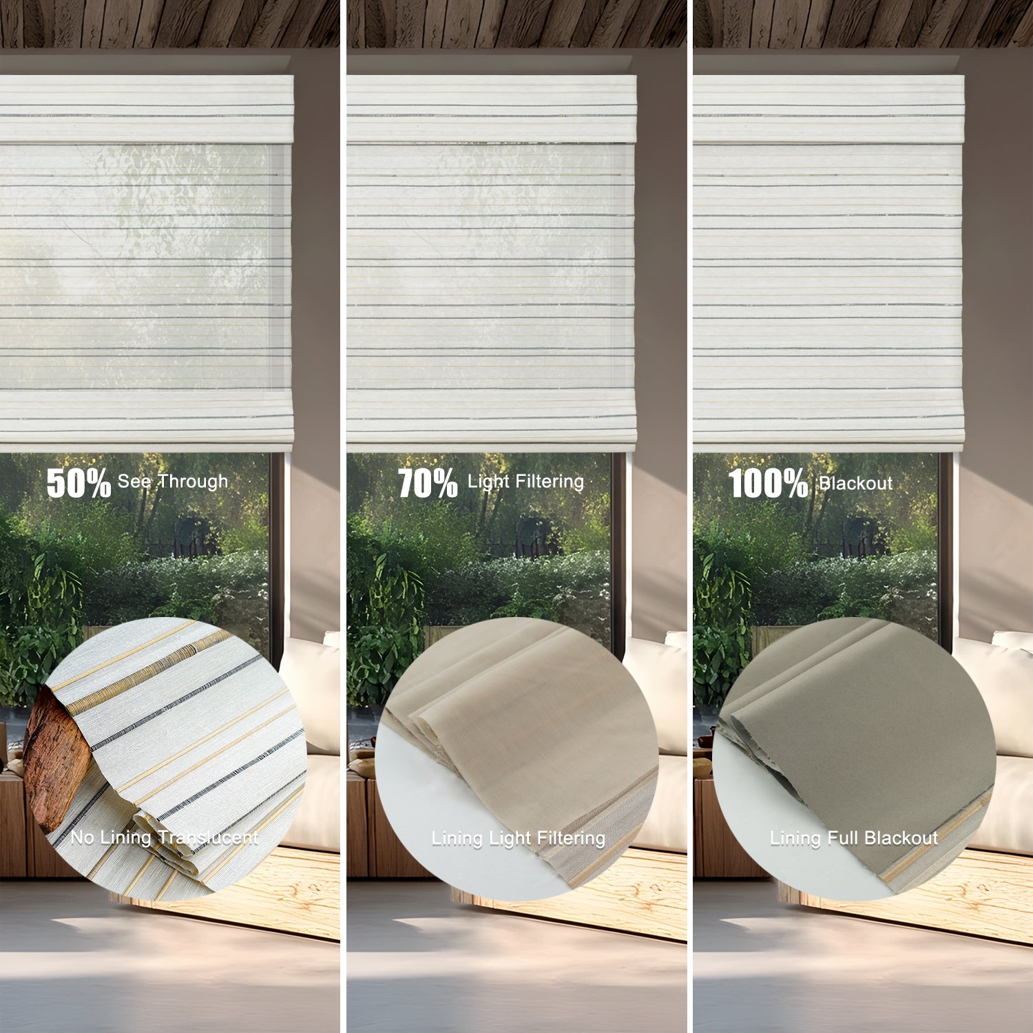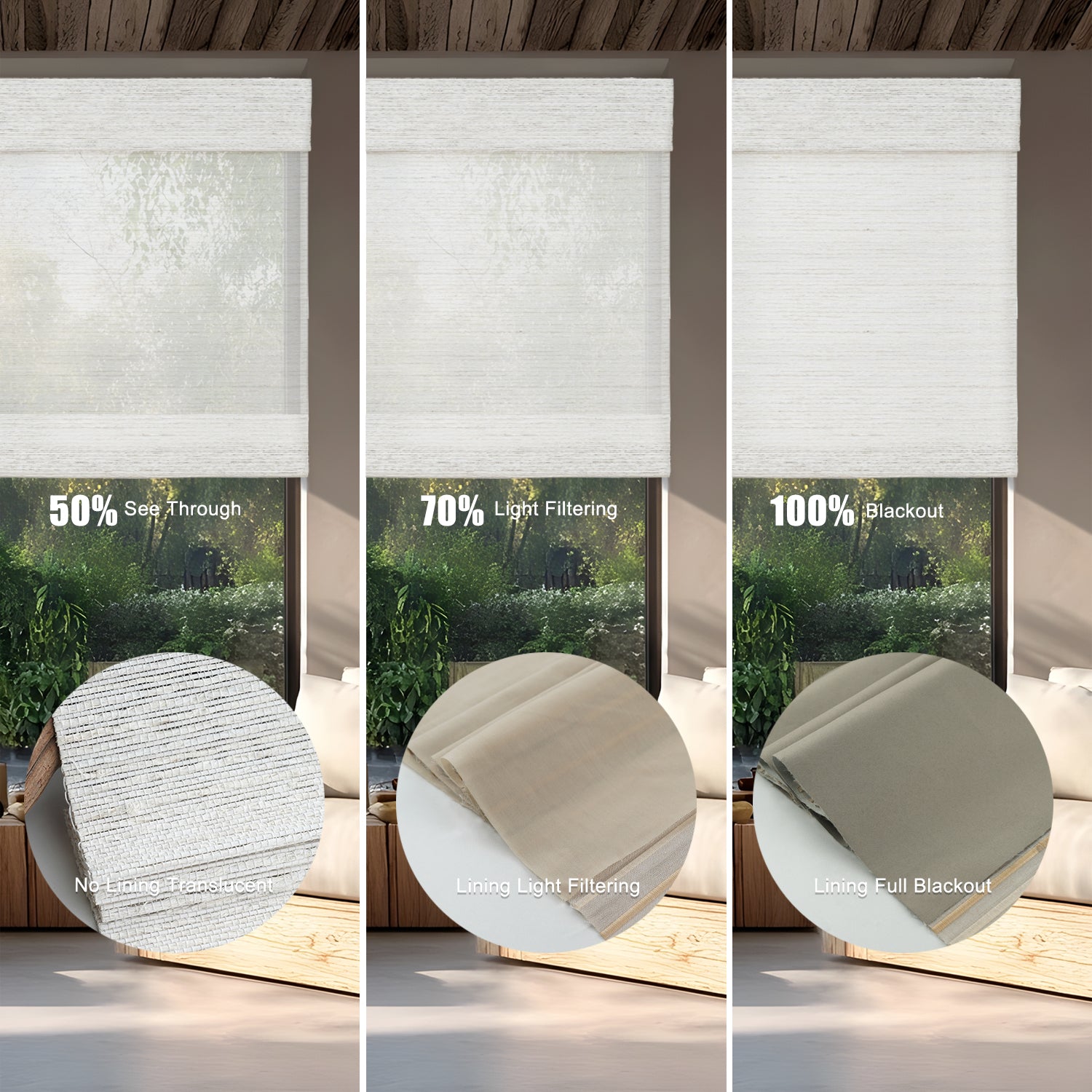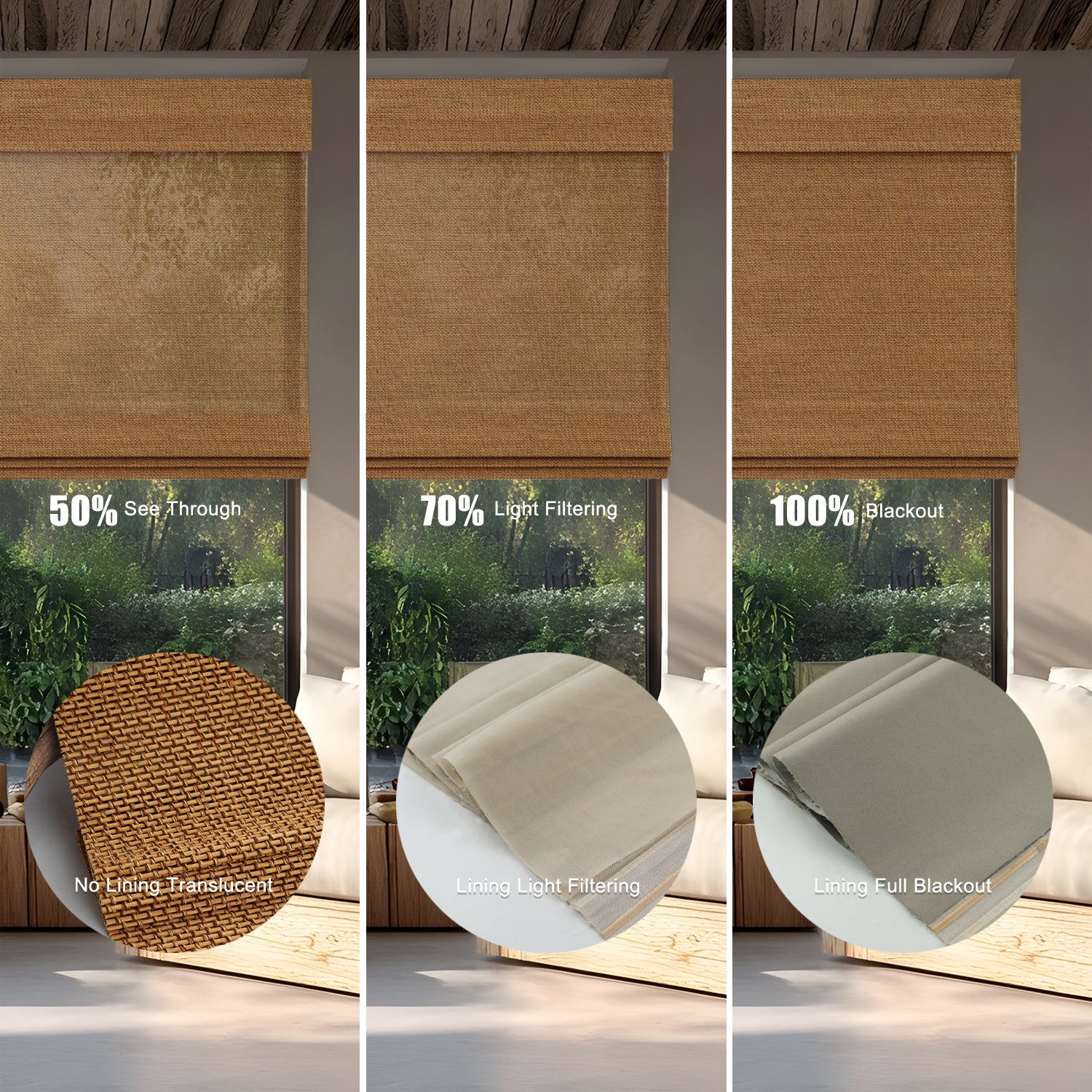 - With Blackout Liner: Maximum privacy and near-total darkness—perfect for bedrooms or street-facing windows. Two shading options : 70% and 100%