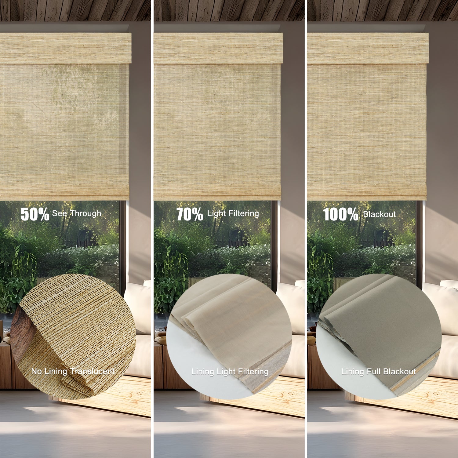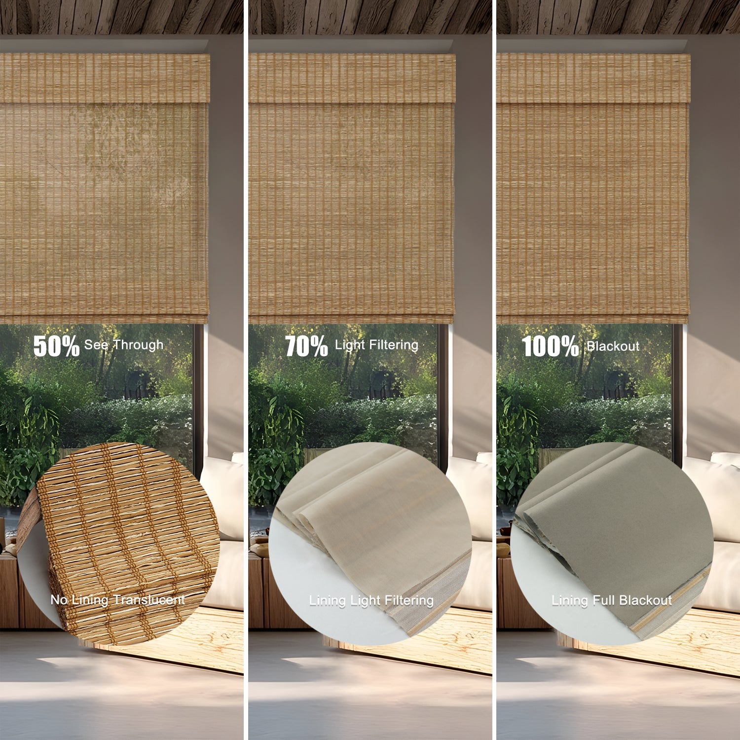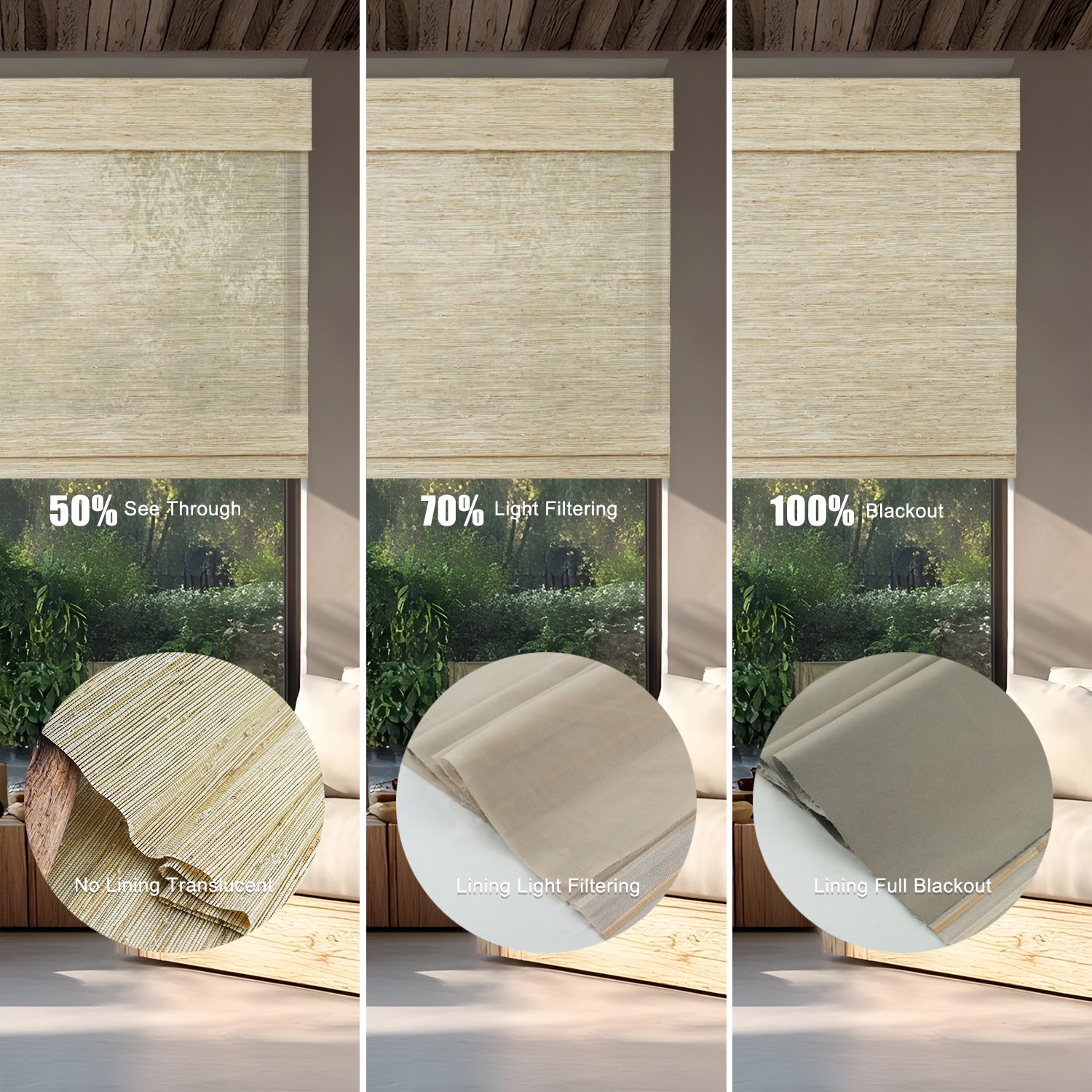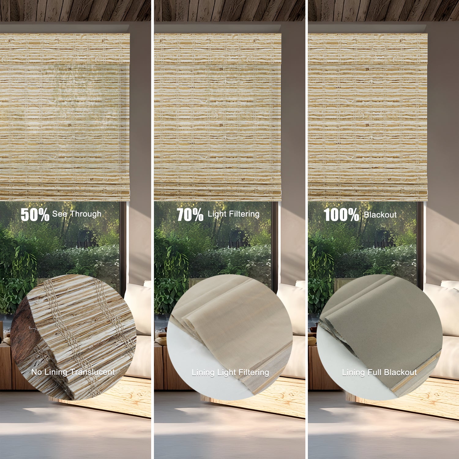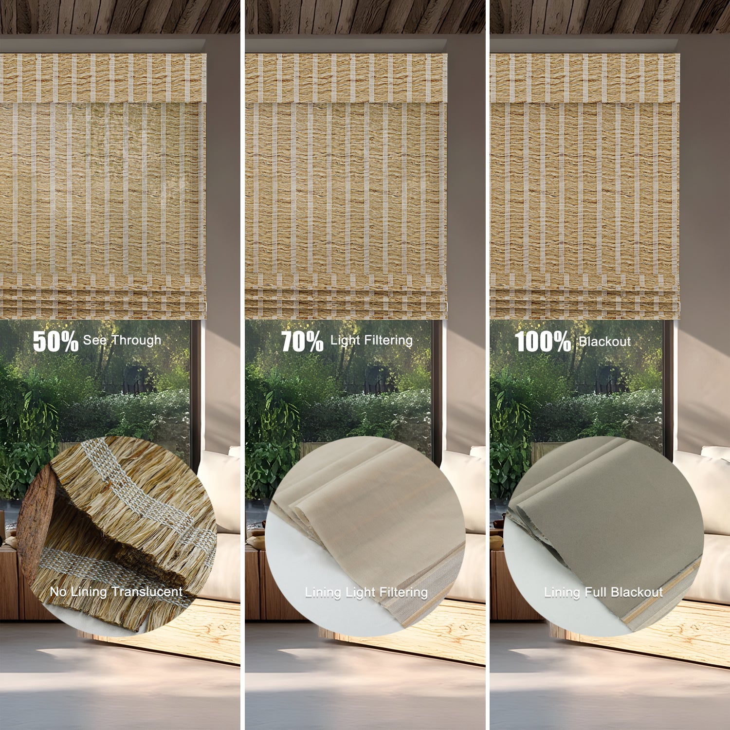 - With Blackout Liner: Maximum privacy and near-total darkness—perfect for bedrooms or street-facing windows. Two shading options : 70% and 100%